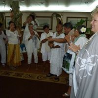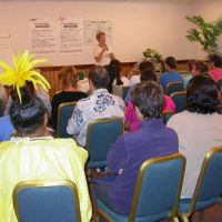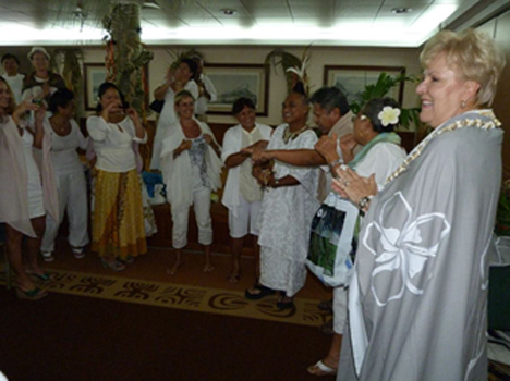 Voici une belle photo prise en mai 2011 qui démontre une sympathique tradition que pratiquent nos chers participants tahitiens à la fin de nos séries d’ateliers. Musique, chant, fleurs, sarong, larmes… Que du bonheur!